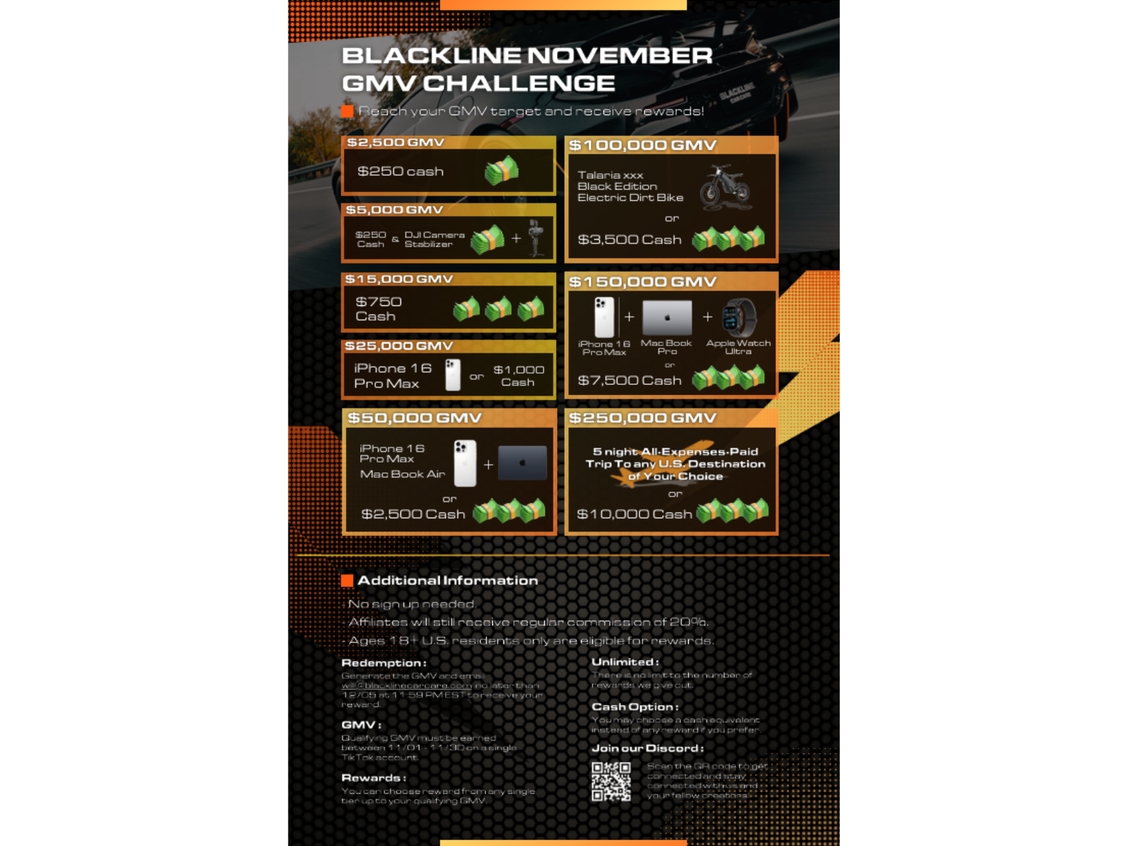 Join the Blackline November GMV Challenge and earn big rewards as you hit your sales goals! From cash prizes to an iPhone 16 Pro Max, MacBook Air, and even a 5-night all-expenses-paid U.S. trip of your choice—there’s something epic for everyone. No signup needed, and affiliates still receive a 20% commission. Track your progress, redeem rewards, and connect with other challengers in our exclusive Discord community. Let’s make November unforgettable!