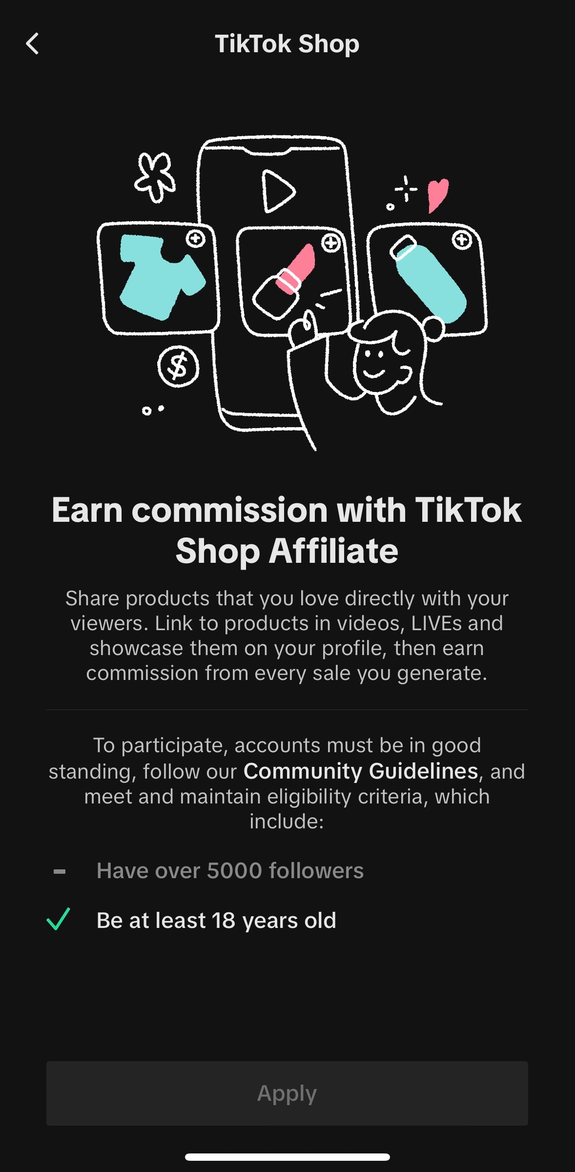 The basic requirements to apply to promote our TikTok shop is 5,000 and be over the age of 18.