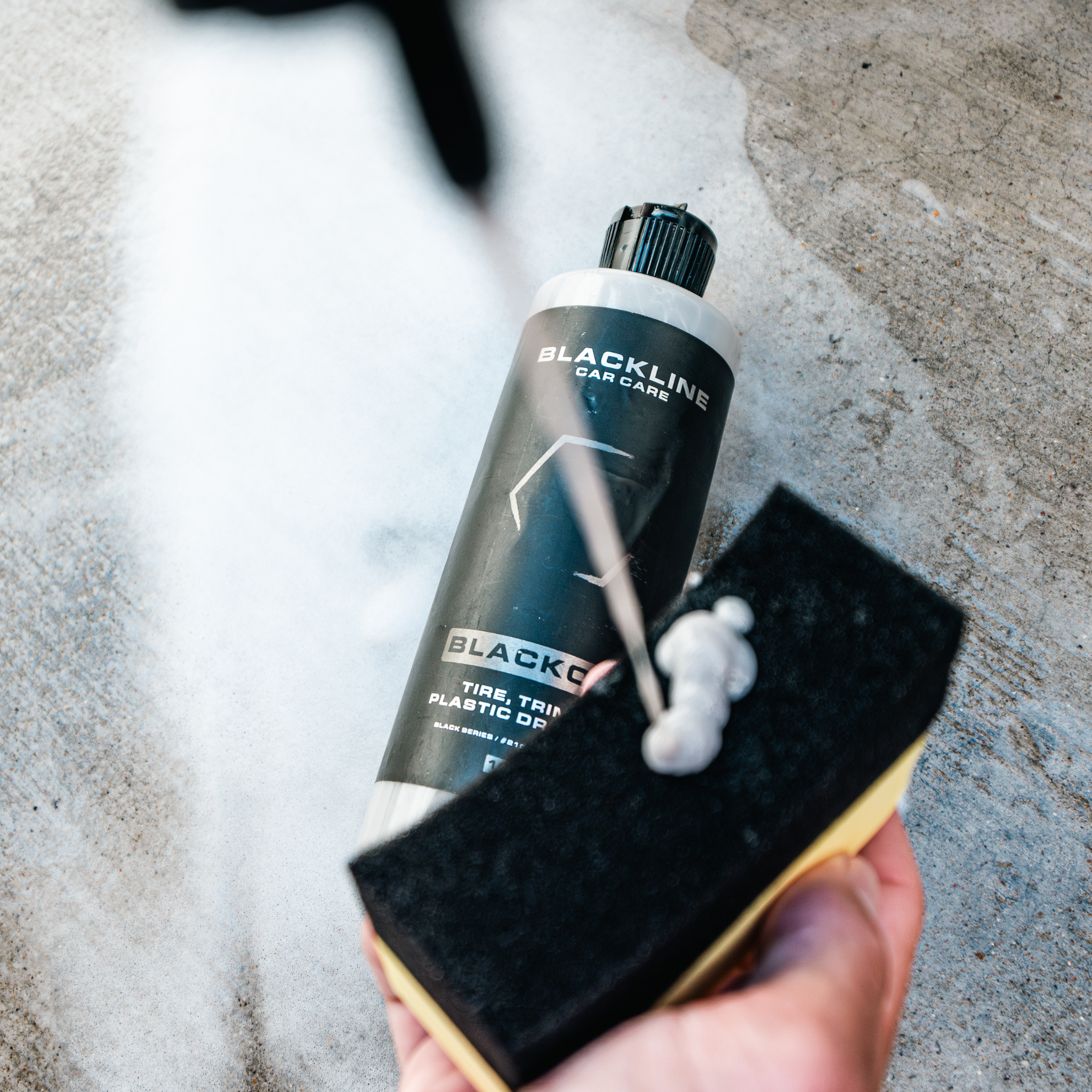 Blackline Blackout Trim & Tire Dressing is a premium Tire & Trim Dressing designed to rejuvenate and enhance the appearance of your tires and trim. Formulated with advanced polymers, Blackout provides a long-lasting, deep black finish that restores the original beauty of your vehicle's plastic & rubber surfaces. Try it on faded plastics, tires, or floor mats.